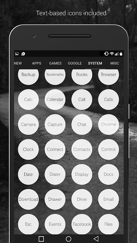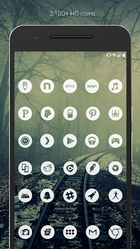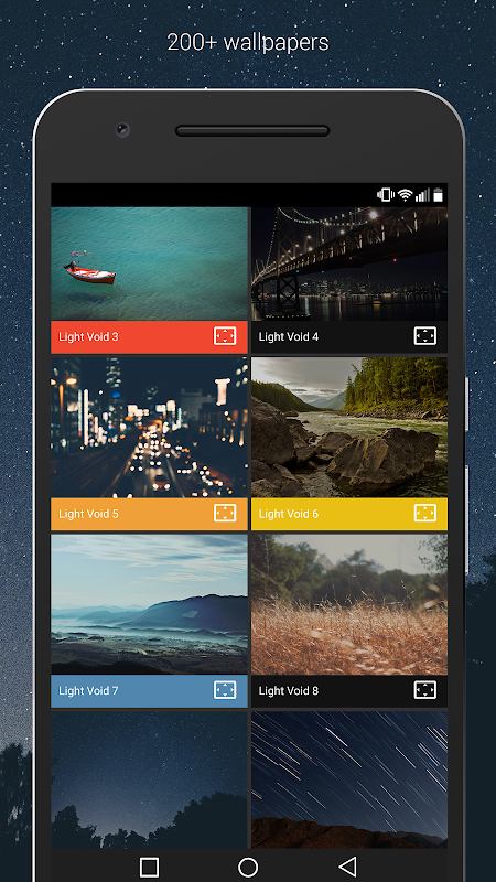 Light Void (pro version) is a simple, clean, minimal, flat icons, matching wallpapers, and widgets for clocks, battery and weather. Icon centers are transparent creating a window to the background behind them. The hollow icon center changes with whatever is behind it making the entire display blend together very well. Widgets offer color, size, and font customization and hand-picked wallpapers of skies, clouds & landscapes are included.