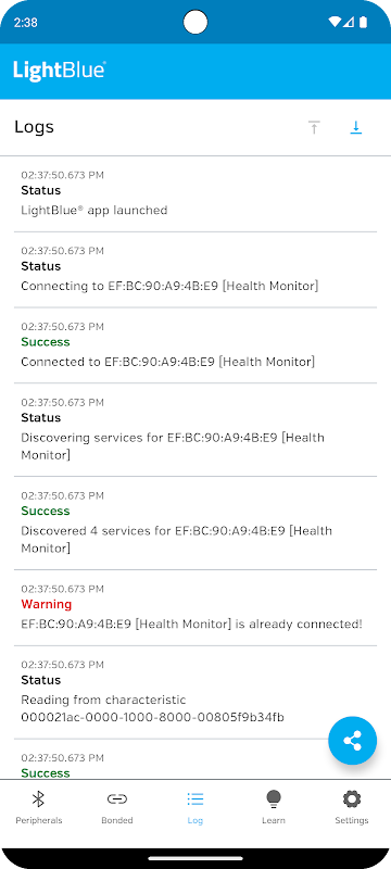 The log feature allows you to keep track of all significant BLE events that occur while using the app (e.g., device discovery, connection, reading, writing).