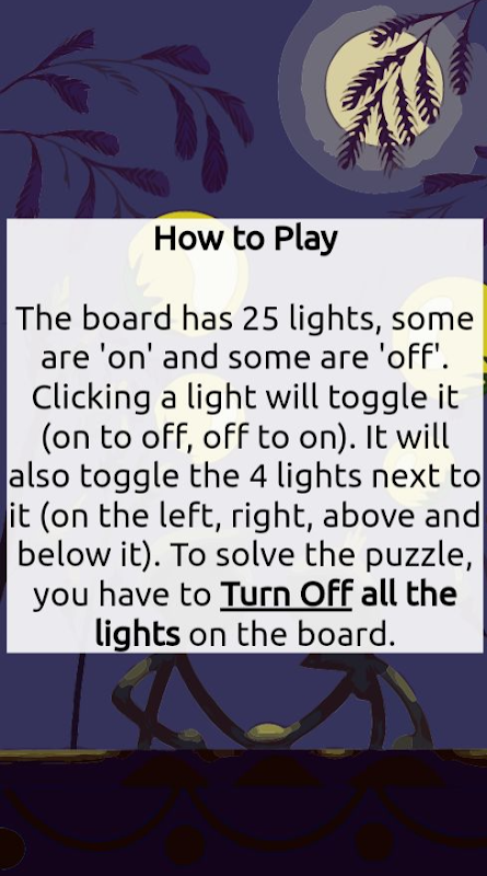 The board has 25 lights, some are ON and some are OFF. Clicking a light will toggle it (on to off, off to on). It will also toggle the 4 lights next to it (on the left, right, above and below it). To solve the puzzle, you have to Turn Off all the lights on the board.