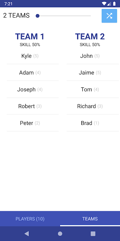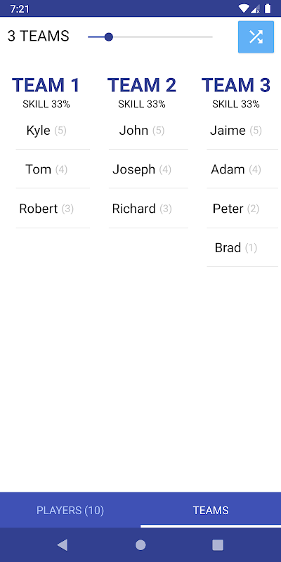 With Lil' Soccer, you can also choose the number of teams you need. Just indicate how many teams you want and the app will generate them in the most balanced way possible.