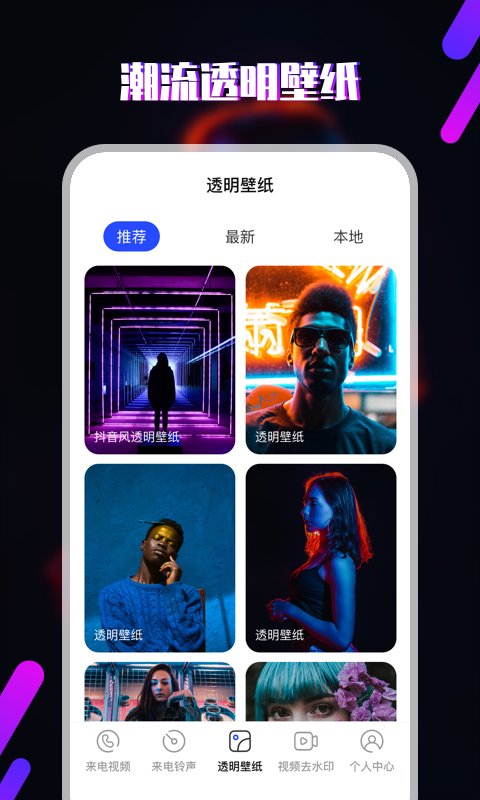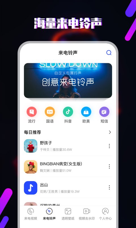 铃声一个集铃声、彩铃、来电秀、透明壁纸为一体的手机来电铃声视频大全软件。热门来电秀、彩铃一键设置。 【来电视频】火热铃声推荐,彩铃、来电铃声、闹钟铃声、通知短信铃声,应有尽有,找不到铃声的都来这里,让来电更加炫酷,支持视频的背景声当做来电铃声,很棒的来电秀。 【透明壁纸】 让你的手机桌面主题壁纸、QQ聊天背景壁纸以及来电视频拥有炫酷个性体验的透明动态壁纸软件,把好看的视频内容一键设置为手机动态壁纸以及透明壁纸,让你的手机锁屏桌面主题设置不同动态壁纸,也能设置QQ聊天壁纸背景。 【来电铃声】涵盖网络流行、轻音乐、个性搞笑、摇滚、时下热门短时频平台等热门铃声。特效、影视、唯美等各色各类视频,每天都有来电秀,天天好心情,炫酷短视频,来电就是炫,用来电彰显个性。 【一键设置】设置流程简单易懂,一键生成来专属来电铃声!