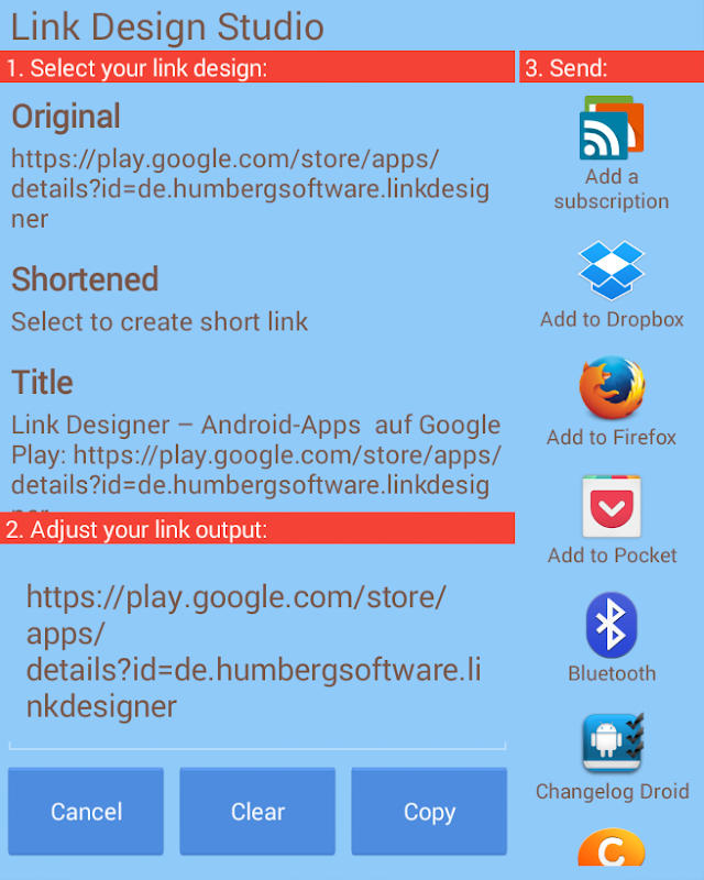Link Designer will adjust links in an easy way. Shortened links can be translated to the real links. Normal links can be shortened or extended by more information of the target site. Just share your link to Link Designer at first, design it and then share it the way you want to share it.
