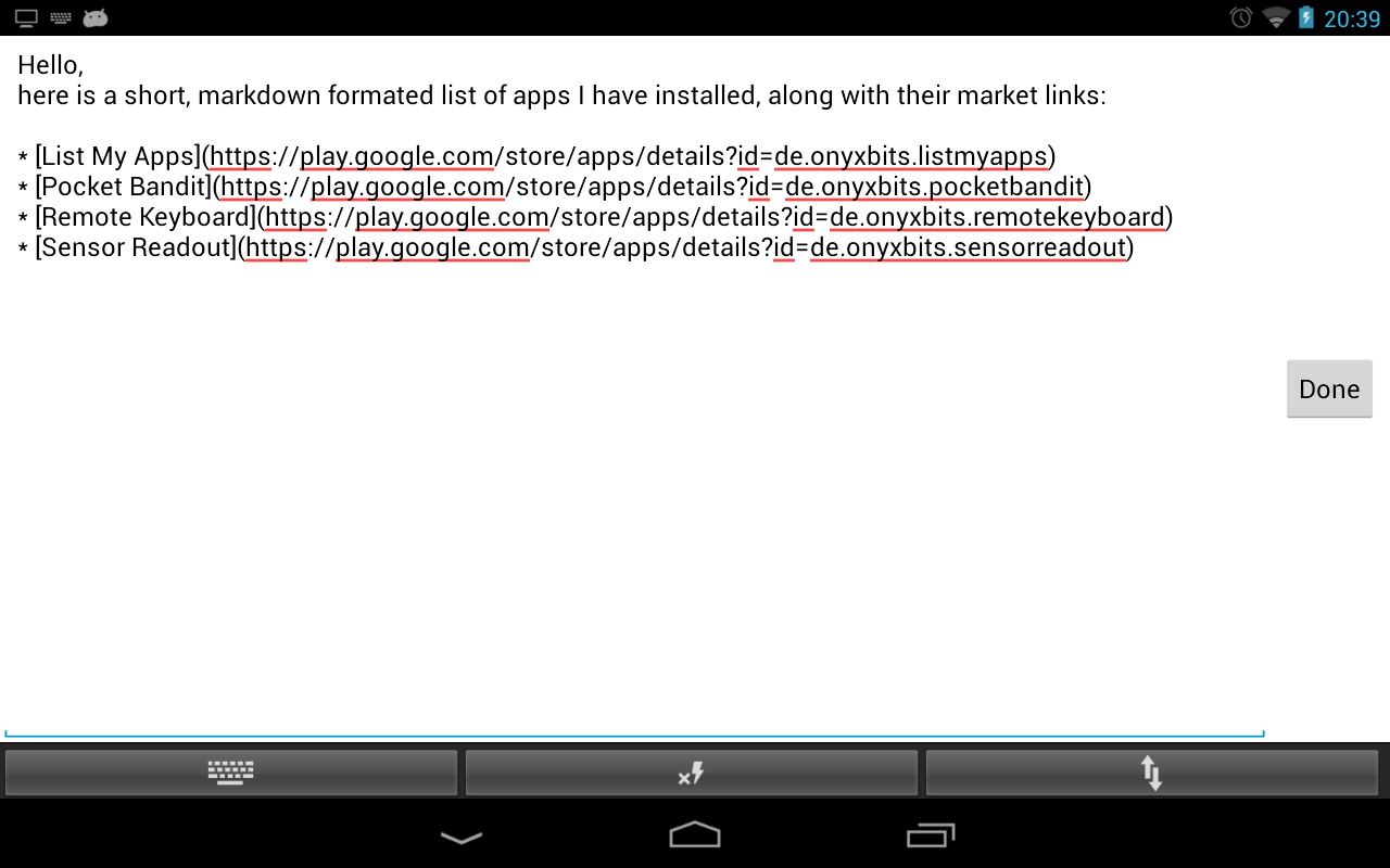 Sifting through the app drawer is a hassle. What should you recommend? Why? and most importantly: how? A list with appname, market link and optionally a comment would be great, but is no fun to compile manually.