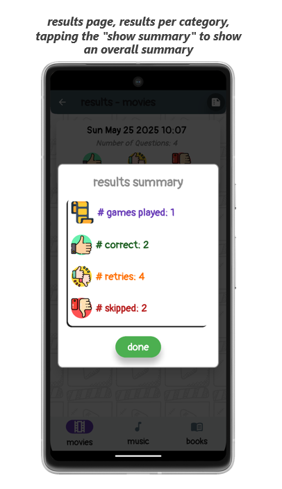 Tapping the "show summary" icon in the app bar shows a summary of all games played in the category.