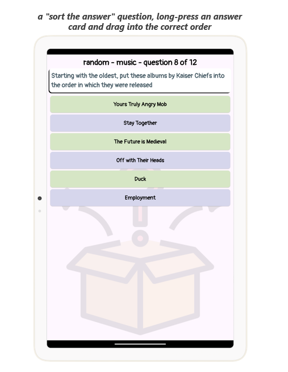 The "sort the answers" question, will show a question and a list of six answers, press the answers and move them into the correct order, once done, tap the submit button to see how you did.