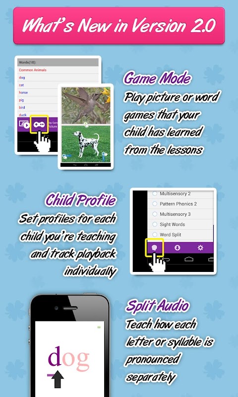 Multimedia learning app designed to help parents teach their toddlers to read.