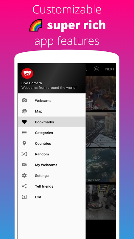 Live Camera is a free app to see live cams video from thousands of public webcams nearby in the streets of your city and all around the world. See people in your city on live cams, CCTV surveillance and security IP cameras, public video streaming webcams! View people activity, animals, auto traffic, cities, weather conditions on the largest database of live real time streaming CCTV security, surveillance, safety network web cameras worldwide. Cool Earth webcam viewer to watch familiar places as well as every new Earth place, discover interesting travel destinations on internet IP cams!