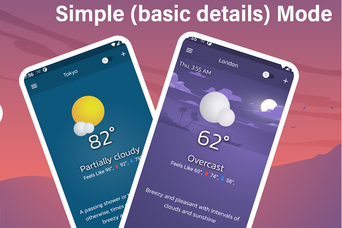 Great weather updates and predictions: Live Weather Update will provide you with detailed hourly predictions, hour-by-hour temperature, chance of rain, pressure, wind speed, and humidity. The app also provides daily weather forecast predictions like weather condition, min/max temperatures, sun rise and sun set for your specific location, number of day hours/night hours, in addition to all the classic weather live parameters.