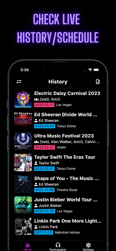 ・You can record information about the live concerts you have attended (artists/ dates/ venues, etc.).