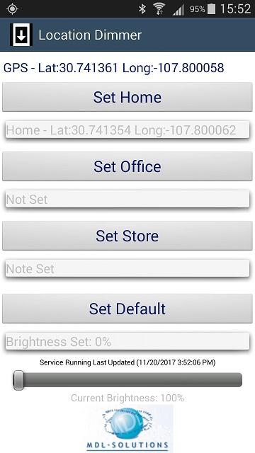 This application is designed to help people who have a sensitivity to mobile phone screens, like people who suffer from chronic dry eye and who find the auto brightness feature on mobile phones to be inadequate or simply not precise enough. It uses the GPS location services on a mobile phone, along with the users stored locations to determine the brightness of the mobile phone screen. This application can also be combined with additional 3rd party screen dimmers in order to obtain the desired screen brightness. The paid version that will follow shortly, will also include the ability to custom define the size of your location. We welcome any feedback you would like to offer at (