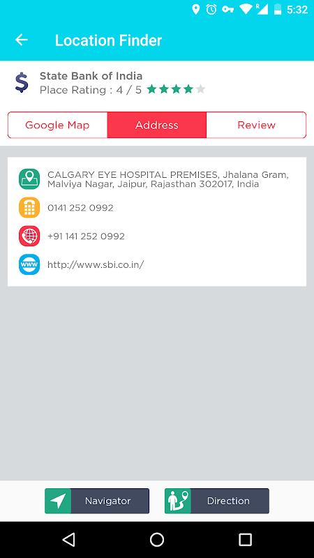 Location Finder quickly helps to find the nearby places, you just need to click the place category and based on existing OR custom location OR both locations, result will display. Once the desired place is found you can see its direction by either selecting Get Direction button OR Navigation view Map button. Navigation map will open Google Map application.