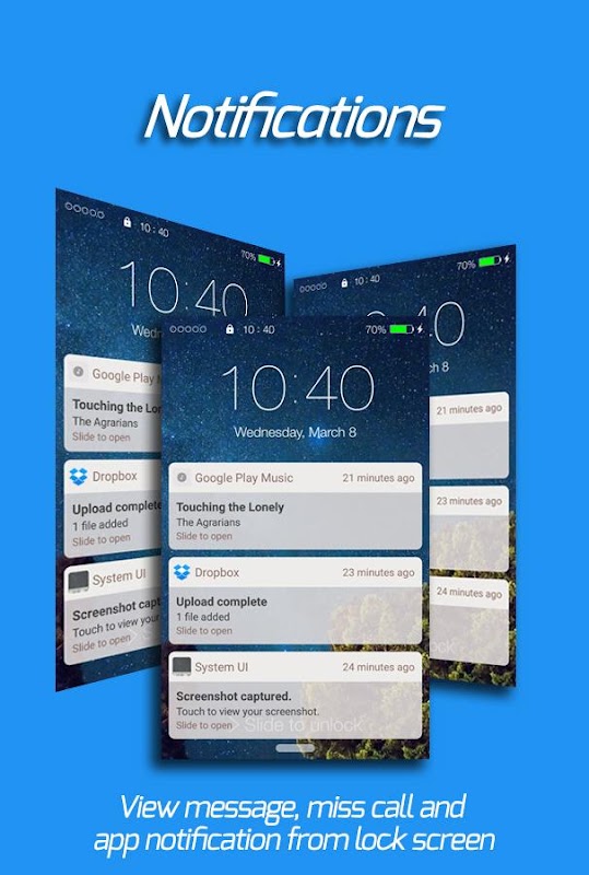 This cool and highly customizable lock screen is based on latest IOS10 os. It comes with latest IOS wallpapers as well. Convert your phone's lock screen to a simply and elegant one. This app fully support new Android M and N.