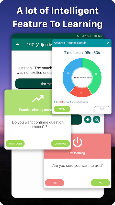 * Many kind of tests such as online test, daily test, etc…Particular statistics at the end of tests will be described clearly your performance, therefore, totally revealing your strength and weakness.