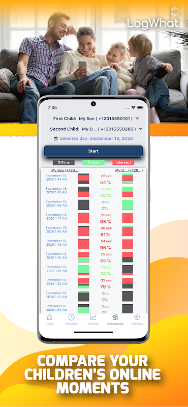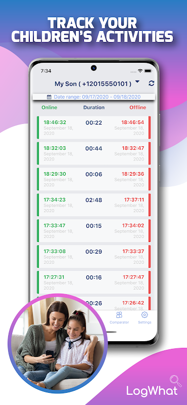 LogWho helps you identify the times your kids spend online. You can compare your child's number with your other child's and can see the which times both of them are online. You can see the online times of young members of your family, see whether they are online while they are studying. Also, are they sleeping at night ? You can check out this. As soon as the your children you follow are online, you can receive notifications and track their online time on charts in daily, monthly and yearly ways. You can see which hours they are online on the clock chart.