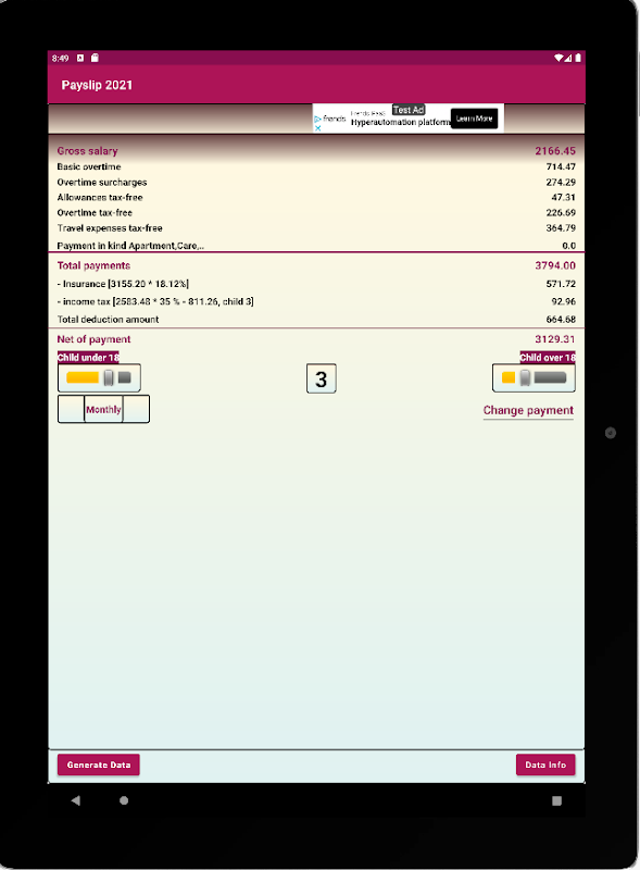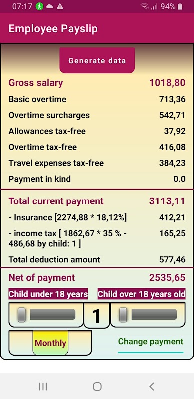 Is a random generator for gross receipts, children, survival, allowances and travel expenses. When generating, the hourly rate is determined then only the hours are generated, then the statutory provisions for §68 / 1 and 2 are applied.