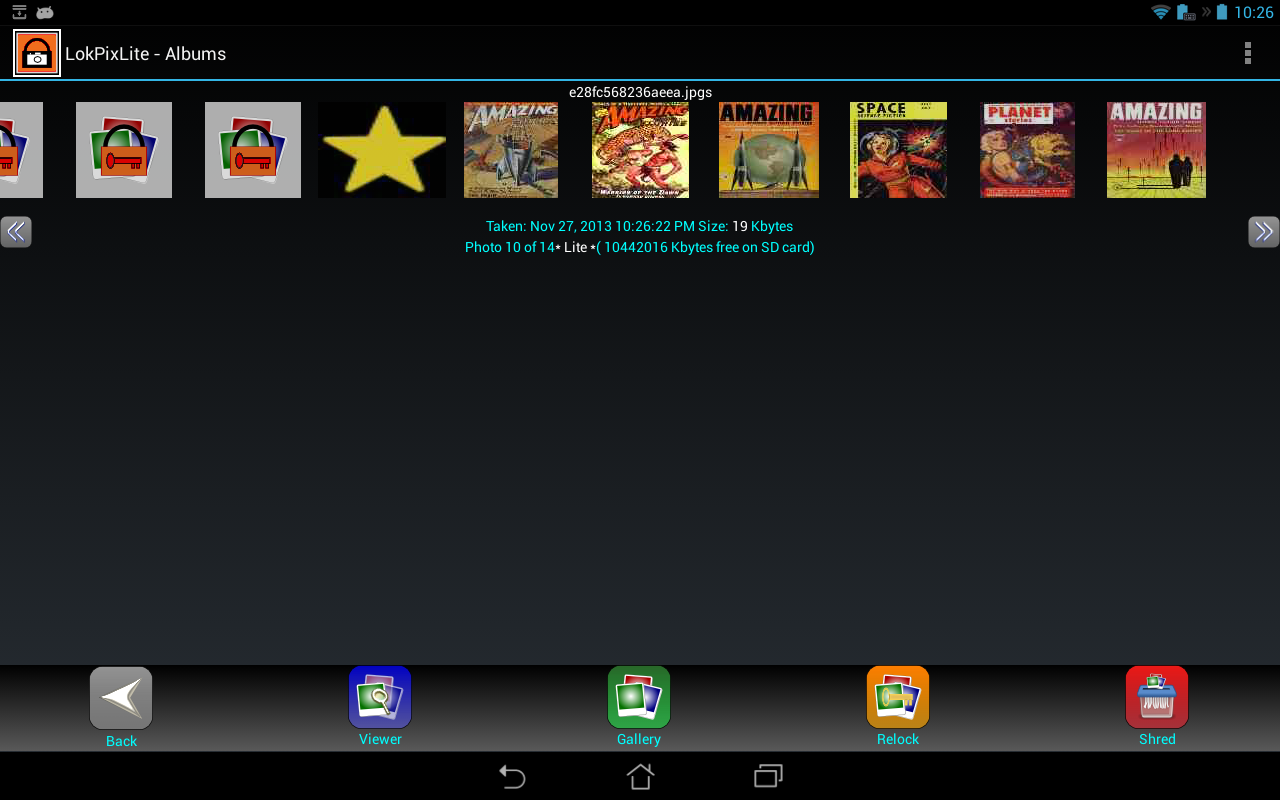 - Slide show – cycles through your secured pictures without having to save decrypted copies on the SD card.