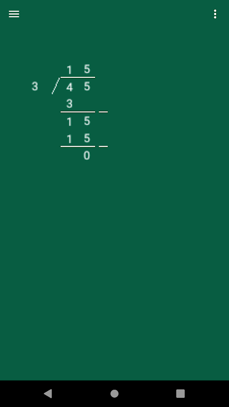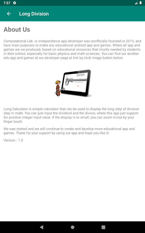 This app is simple calculator that can be used to display the long step of division step in math. You can just input the dividend and the divisor, where this app just support for positive integer input value. If the display is to small, you can zoom in/out by your finger touch.