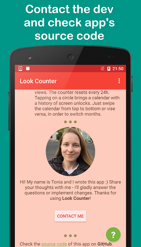 Why you may need this info? Well, perhaps you'd be surprised to know that the average person checks her phone around 110 times a day, and some - up to 900 times! Or maybe you feel guilty, checking your phone too often, and want to motivate yourself for a change? Or you're just interested in statistics, or suspect your phone in turning on without your knowledge. With Look Counter, all of the above can be easily verified!