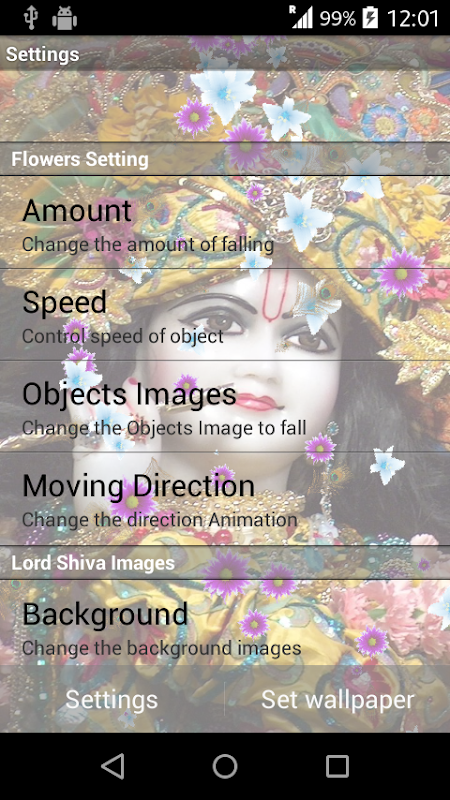 "Lord Krishna Live Wallpaper" app contains multiple Special Lord Krishna wallpaper and you can easily control the Flowers,animation speed by setting options. choose various types Flowers .move up and down the animation.Lord Krishna is a Hindu God and Peoples of India celebrate Lord Krishna birth as Krishna Janmashtami, this festival mostly comes in the month of August and September .