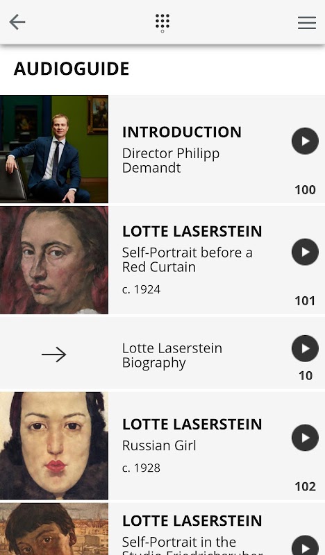 Get the audio guide to the exhibition “Lotte Laserstein. Face to Face“ and explore the work of an extraordinary artist. The audio commentary takes you on a journey through the Berlin of the 1920s and 1930s. The app includes information (audio tracks and pictures) on 19 artworks and takes about 60 minutes.