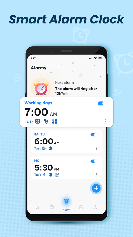 Smart alarm clock app with alarm sounds to wake up on time. Sleep sounds setting