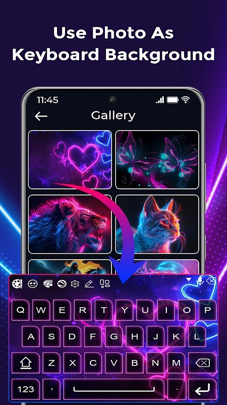 Customize your rainbow keyboard with colorful neon effects using this my photo keyboard app. Change your keyboard background with various neon colors and enjoy the glow keyboard effect, neon exchange, keyboard changer, and custom colored keyboard with neon text effects.