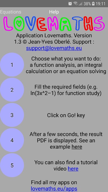 For integrals calculation, a function has to be specified in the first text box. The lower and upper bounds of the integral have to be given in the second text box as an interval (e.g. [3;+∞[). If no interval is specified at the time the "Go!" button is pressed, antiderivative is calculated. As for function study, result is a PDF file. An internet access is required. In case a bad function or interval is entered or if a problem occurs while trying to connect to the internet, a descriptive error message is displayed.