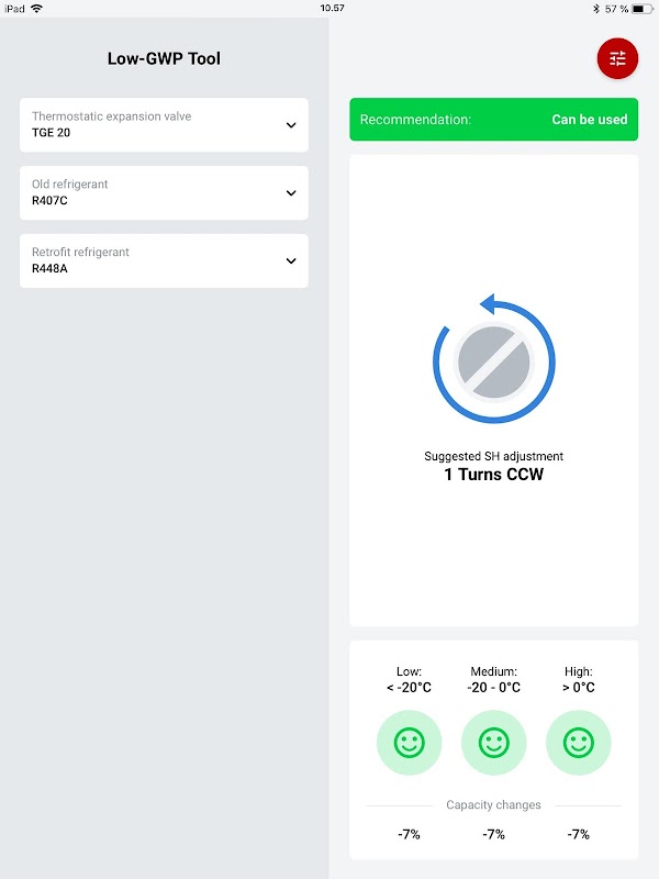 Low-GWP Tool ensures compatibility with the TXV and uses a simple calculation to show the indicative capacity difference of a retrofit refrigerant. Simply enter basic information, such as TXV type, current refrigerant, operating range, and retrofit refrigerant, and Low-GWP Tool will verify that your refrigerant choice is efficient, environmentally friendly, and compatible.