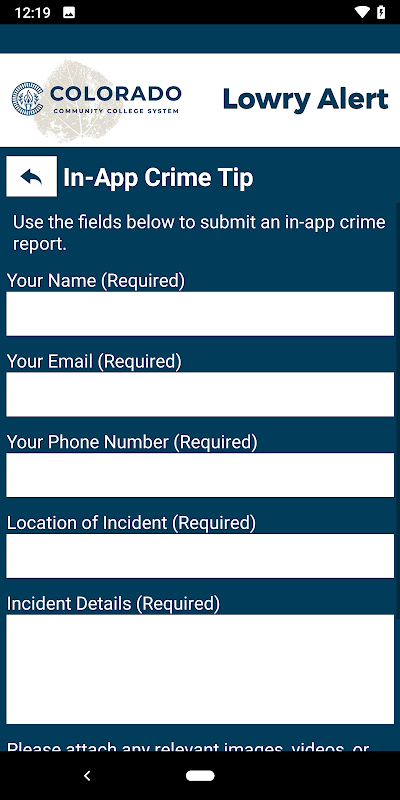 Lowry Alert is the official safety app of Colorado Community College System - Lowry Campus. It is the only app that integrates with CCCS Lowry's safety and security systems. Campus Security has worked to develop a unique app that provides students, faculty and staff with added safety on the CCCS Lowry campus. The app will send you important safety alerts and provide instant access to campus safety resources.