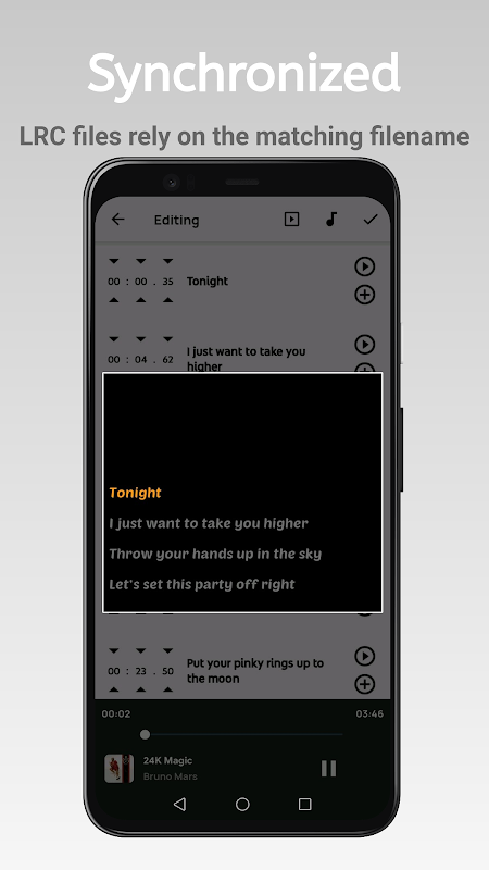Whether you're a musician, karaoke enthusiast, or simply someone who loves to personalize their music experience, this app offers a seamless solution for synchronizing lyrics with your favorite music tracks.