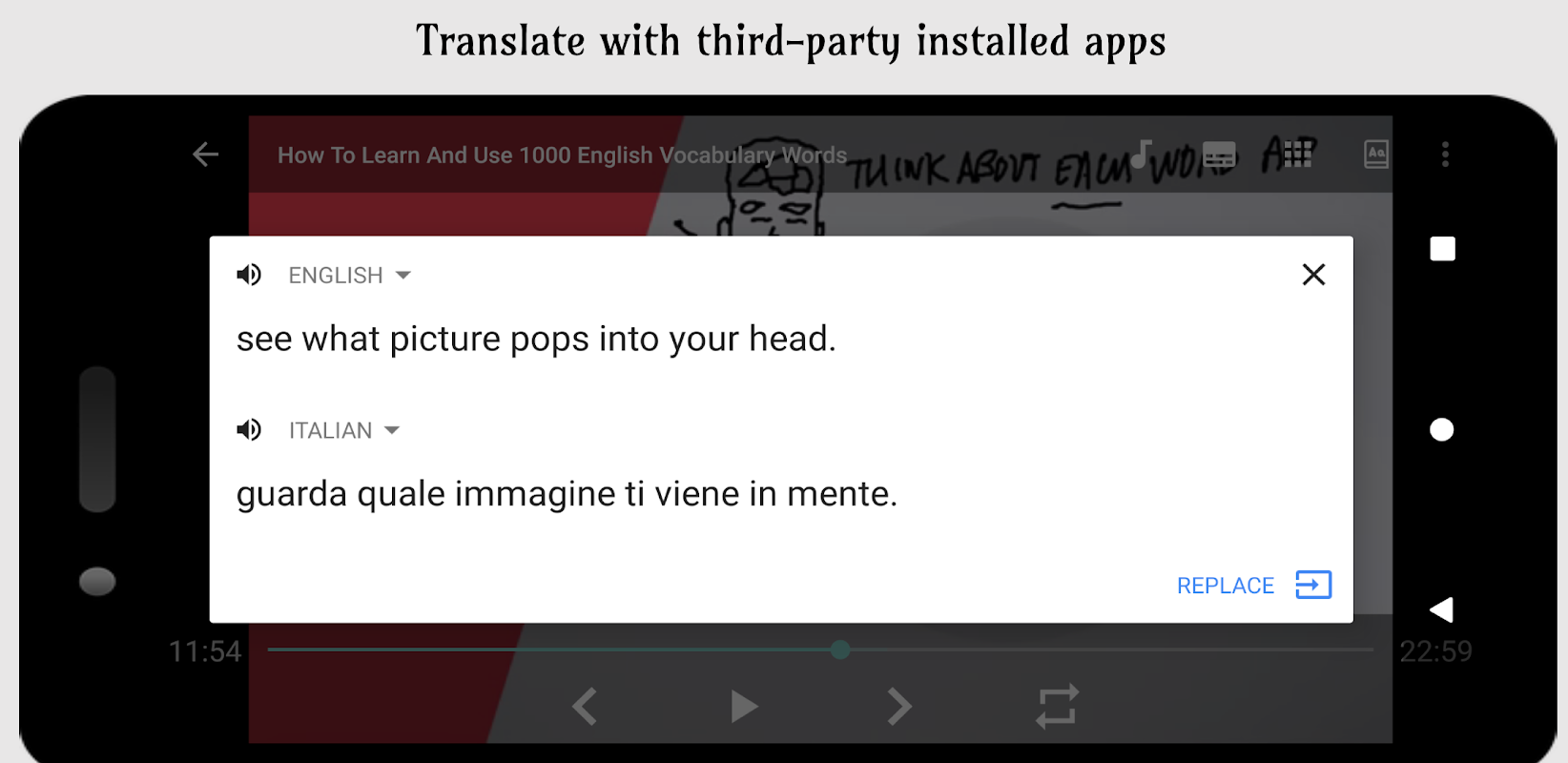 How it works: You are watching your favorite movie on language that you prefer to learn with subtitles on that language. If you don't know some words or full sentences then just only tap on this word or select full sentence and you'll see popup with translation on your known language.
