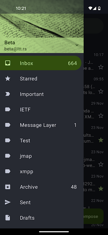 Ltt.rs (pronounced Letters) is a proof of concept email (JMAP) client currently in development. It makes heavy use of Android Jetpack for a more maintainable code base than some of the preexisting Android email clients.