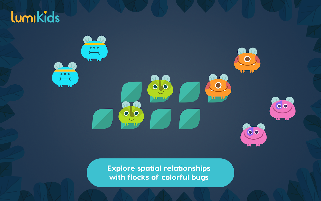 ** EXPLORE SPATIAL RELATIONSHIPS: Explore flocks of colorful bugs that all fit together like a living puzzle. Figure out how to arrange the bug flocks on to the leaves, seeing how the flocks fit together based on spatial arrangements.