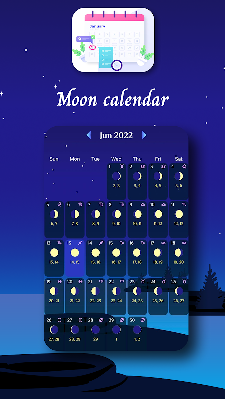 Lunar Calendar – The Moon Calendar is an app that calculates a lunar day for every current calendar date. Using our lunar cycle & phases of moon calculation from newmoon to full moon and every stages in between. We will make recommendations and suggestions for various aspects of your life including: warnings, relationship, career, and more. Our app also includes moon phase and zodiac signs calculation for more precise recommendations.