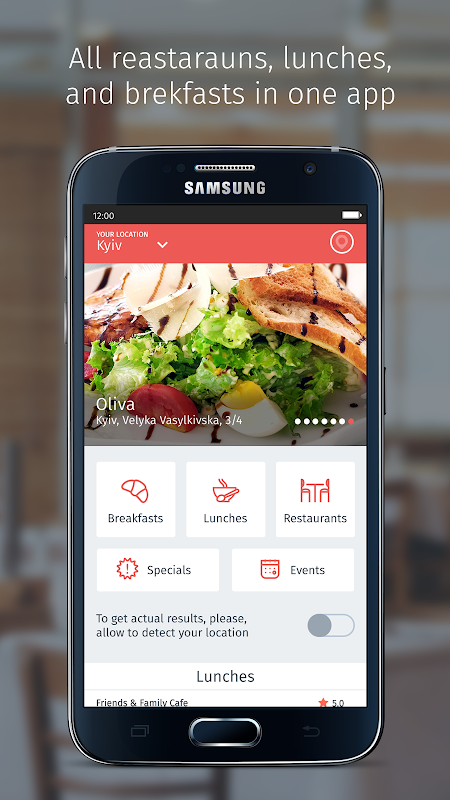 The LunchPoint application is your reliable daily assistant. In order to find an inexpensive menu nearby you do not need to know the restaurant name or address in advance.