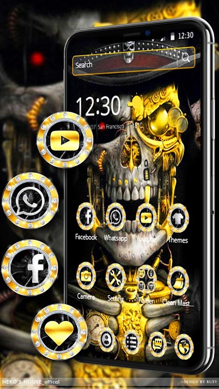 -đLuxury Golden Metal Skull Theme icon design will make your cell phone more personality devil. Full of cool and dark style&gold(golden) devil skull, but also highlights your unique taste.
