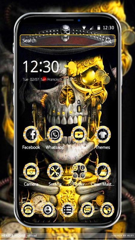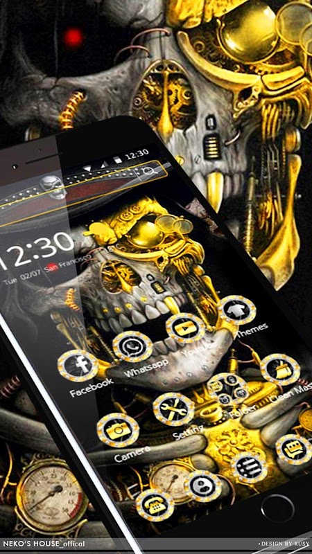 đLuxury Golden Metal Skull Theme applies to all the people who like gold and cool launcher style&love 3D science technology friends.
