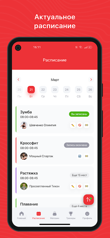 - Получать PUSH-уведомления о предстоящей тренировке за 3 часа.
