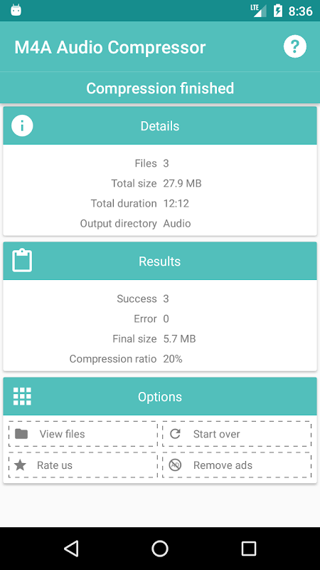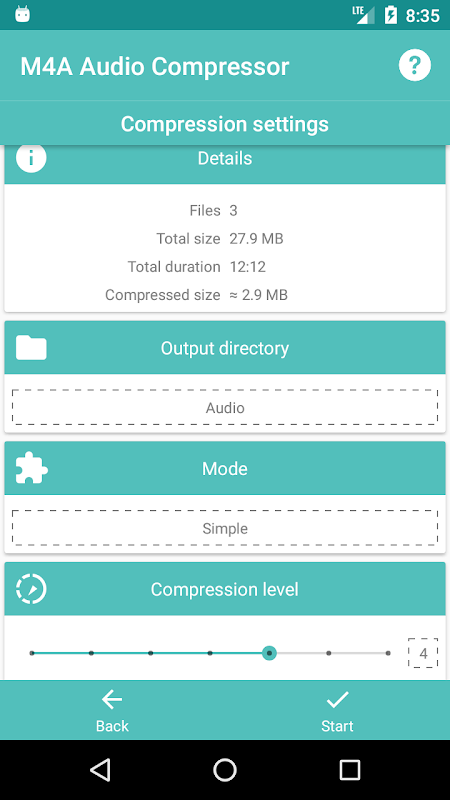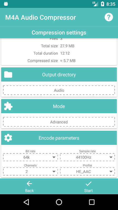 M4A Audio Compressor will allow you to compress your favorite audio and music files. Freeing space on your device. Or to make it easier to send by mail and social networks.