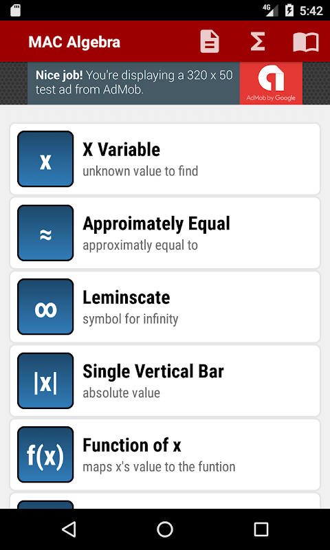 MAC Algebra is for student taking College Algebra. It provides students with key formulas and symbols to reference and study to assist with your homework. MAC Algebra also contains a notes section for taking notes in class or writing a review to study later.