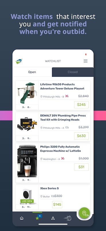 Buy brand name merchandise at up to 80% off retail pricing with the MAC.BID Auction App. Now you can view items and place bids in every MAC.BID auction from the convenience of your phone or tablet. Browse merchandise by category or search for exactly what you want. Place absentee and live bids on your favorite products, or browse upcoming and past auction catalogs, quickly and conveniently. MAC.BID allows everyone to save on all types of consumer products and customer returns.
