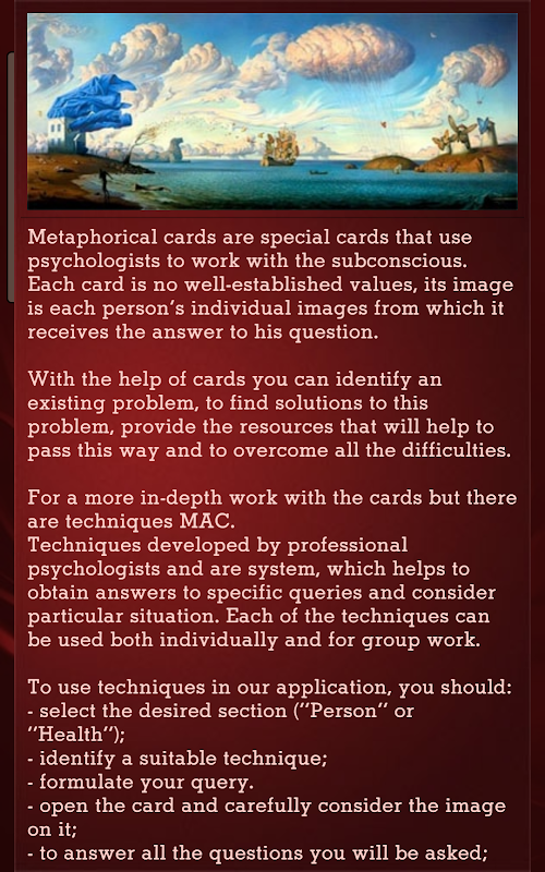 The application will be interesting both to people interested in working on themselves and those providing professional consultation services via the metaphorical cards. The proposed techniques are effective, both in individual work and work involving a coach, trainer or therapist. Metaphorical cards can be used as a psychological test of the current state or for understanding what you need to do to close your Gestalt.