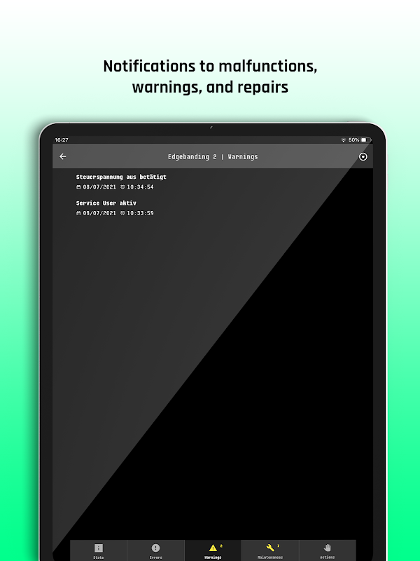 • Receive push notifications on your smartphone, tablet or smartwatch when problems occur or interactions are required on one of your machines.