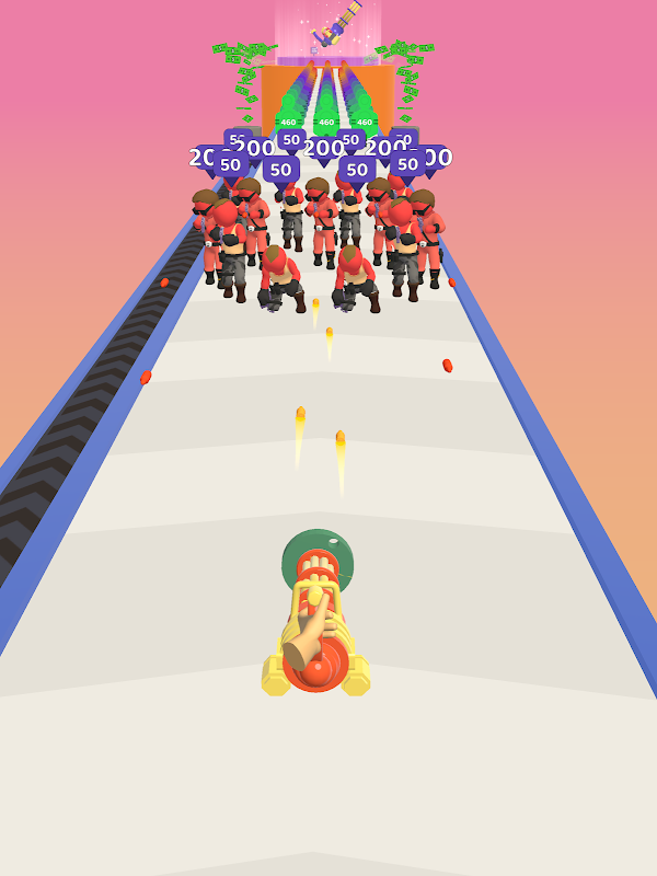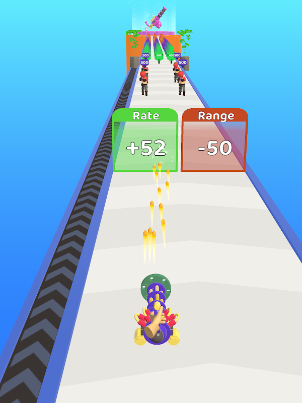As you accumulate gun barrels, watch in awe as your machine gun transforms into a formidable powerhouse. The barrels move to a side belt, powering up your weapon with each collected batch. Unleash a storm of bullets upon your foes as you pass through gates to level up, increasing your shooting power and range.