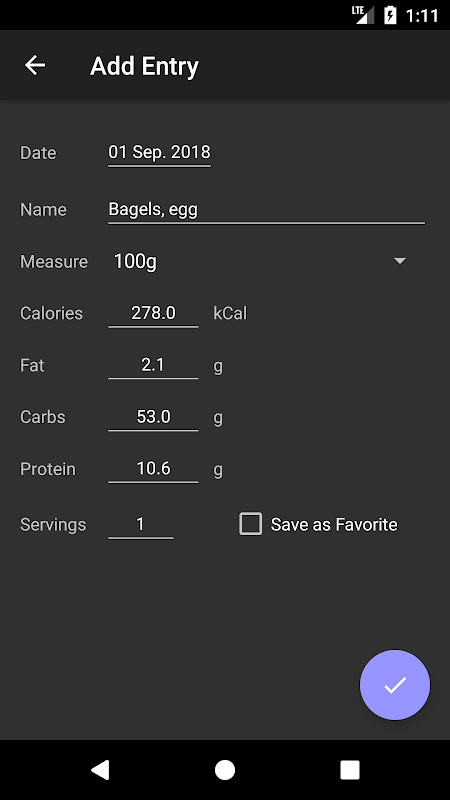 This App provides an easy and intuitive way for you to keep track of your daily calorie and macronutrient intake. You can also save your favorite meals and check your History to see how you did in past days.