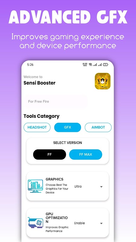 This app allows you entertain yourself with one tap shots. It have gfx tool guide and sensitivity settings. By using this custom HUD and sensi you can easily improve your skills and become a pro one tap player.