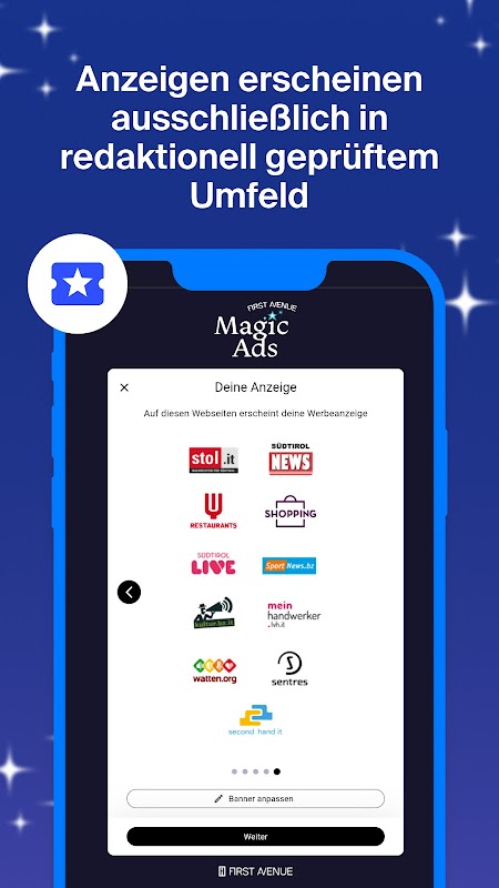 Thanks to our AI, the banner design is optimized according to your specifications. Select your product, event or offer, enter a link and the AI will design the banner. You can publish the design directly on the leading regional portals such as STOL, Südtirol News or Sportnews as well as on 9 other First Avenue portals - at a fixed price with no hidden fees or setup costs.