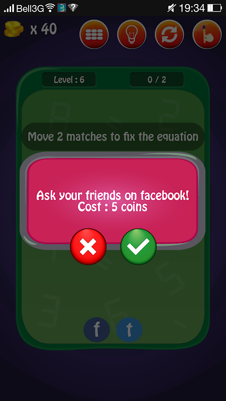 It boasts more than 100 levels and even more levels are added regularly! In each level, the player needs to move 1 or 2 matches to fix the otherwise wrong equation! If you got stuck, you can get hint from the system or ask your friends on Facebook or Twitter to help you via links like this: http://www.magicmatchmath.com/magic_panel/site/show_level/3