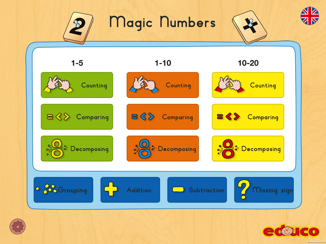 The 3 main activities develop a strong number sense by counting items, comparing numbers and quantities, and decomposing numbers. 4 other activities are focused on training main maths exercices: addition, subtraction, grouping and missing sign.