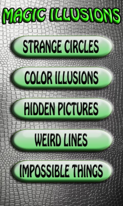 In this application you can find a lot of magic illusions like impossible triangles, crooked walls, appearing and dissapearing objects, brain circuit, shadows in square, moving circles, spinning wheels and many more.